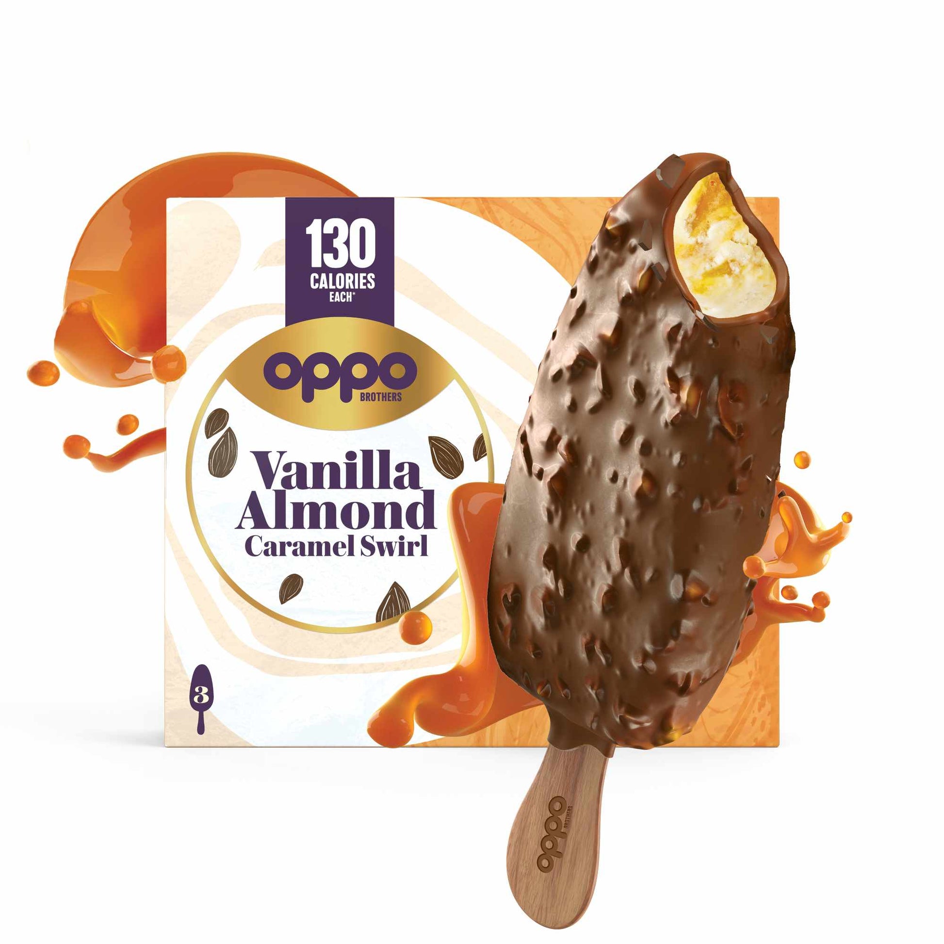 Unsere Vanilla Caramel Almond Swirl Eis Am Stiel sind eine köstliche kleine Leckerei. Cremiges Vanilleeis mit einem üppigen Karamellwirbel und einer dicken Schicht belgischer Milchschokolade mit gerösteten Mandelsplittern. Und das bei nur 130 Kalorien pro Stück.